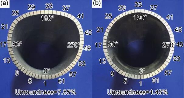 管材在彎曲時,在彎矩的作用下,中性層外側受到拉應力,內側受到壓應力,二者的合力使管件法向直徑減小,橫向直徑增大,管件截面由圓形變為近似橢圓,即發生畸變。在管徑、彎曲半徑及潤滑條件不變的情況下,通過不帶芯頭的聚氨酯芯棒和帶有一個芯頭的剛性芯棒分別進行CNC彎曲,得到了2種具有不同不圓度的截面,如圖C所示。其中聚氨酯芯棒的好處是可以使管件內部避免劃痕,但得到的彎管截面不圓度較大;帶有一個芯頭的剛性芯棒的好處是得到的彎管截面不圓度較小,但與管件內部發生硬接觸,容易在彎曲過程產生內部劃痕。