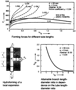 德國 Paderborn 大學的 F.dohmann? 等人經過研究后指出:由于摩擦的影響,在成形過程中軸向力總會有所損失。在 T 型三通管內高壓成形補料的過程中,當水平沖頭的軸向推力超過一個臨界水平,壓縮失穩就會在管坯不規則的壓縮變形處產生。他們給出了一個實例來說明補料段管長對可獲得的枝管高度的影響,如圖 1-10。經過理論的推導計算,得到了出現失穩狀態的判據。