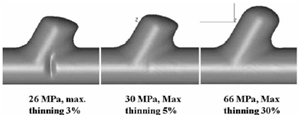意大利Palermo大學的N. Alberti,L. Fratini對材料是AISI1015鋼,壁厚為1mm的T型三通管進行了有無反推沖頭的數值模擬研究。研究結果表明采用反推沖頭后三通管減薄更小,壁厚更均勻。