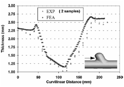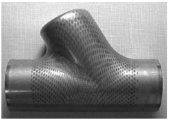 美國俄亥俄州立大學的學者對 Y 型三通管內高壓成形進行了深入的研究。他們討論了如何對內高壓成形 Y 型三通管的工藝參數進行估算,這些參數包括成形壓力、軸向補料量、原始管坯長度,給出了一些計算公式。然后通過 FEA 模擬對估算的工藝參數進行優化,確定了合適的加載路徑,用外徑為 50.5mm, 壁厚為 1.5mm 的管坯進行了實驗,并在德國 Aalen 的 SPS 研究中心成形出了枝杈夾角為 60°的 Y 型三通管,如圖 1-14。成形零件的壁厚分布和模擬得到的壁厚分布吻合比較好,如圖 1-15。通過實驗,還研究了在沒有反推沖頭作用時管坯長度對枝管高度的影響,結果表明在軸向進給量相同的情況下,管坯長度越小,脹起的枝杈高度越大。