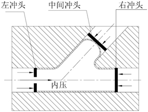成形過程為在一定內壓下,左右沖頭按與內壓一定的匹配關系向內補料;中間沖頭置于模具右側圓角與枝管的交界處,在成形的初期保持不動,等管坯貼上中間反推沖頭后,中間反推沖頭隨著枝管的長高向后退,后退時中間反推沖頭要對枝管施加一定的推力。