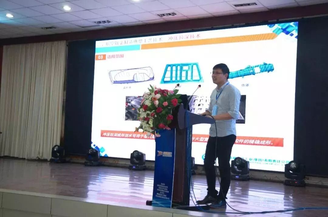 萬敏教授所作的學術報告題目是《板料充液拉深液室壓力加載路徑快速設計方法研究及應用》 ,他簡單地介紹了北京航空航天大學的板料成形研究中心,中心主要研究航空復雜鈑金結構件工藝設計與成形制造技術等項目,主要對象是飛機鈑金零件,成形方法有充液成形、橡皮‘囊’成形等。萬敏教授還指出,在使用板料充液成形技術實現飛機復雜鈑金零件成形時還存在有不少問題,例如:缺乏工藝分析方法、過分依賴過往經驗、缺乏模具設計標準規范等。而在講到板料充液成形這方面時,萬教授還特別稱贊表揚了興迪源機械的先進液壓成形設備。