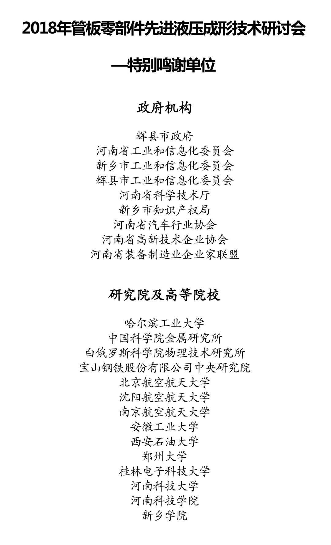 導語:6月28日-30日,2018年管板零部件先進液壓成形研討會在河南省輝縣市召開。為進一步推動我國航空航天和汽車制造業輕量化智能成形技術,特別是以低塑性材料和復雜結構管/板類零件成形為代表的液壓成形新技術和新工藝的發展,為高性能輕量化零部件提供國際領先的高效率、短流程、綠色智能制造的前瞻性技術支持,促進學術思想和學術成果的交流。此次會議邀請了中國薄鋼板成形技術研究會理事長、理事、中國科學院金屬研究所及有關單位專家就高速沖擊液壓成形、超高壓脈動液壓成形、內高壓成形、高溫氣脹成形、管材自由彎曲等技術進行專題交流和討論。