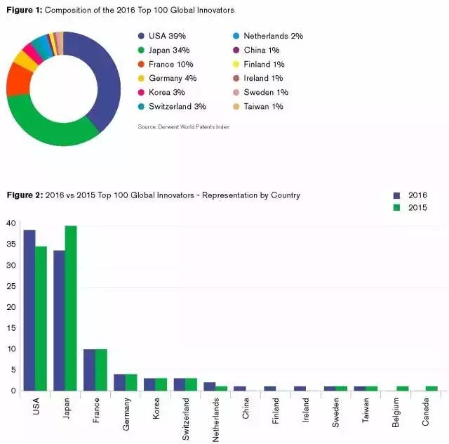 下圖是Clarivate Analytics發布的2016年全球最具創新企業100強,美國和日本分別以39家與34家企業,遙遙領先。