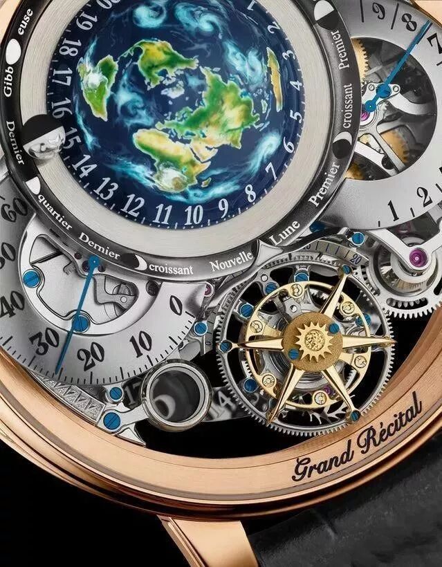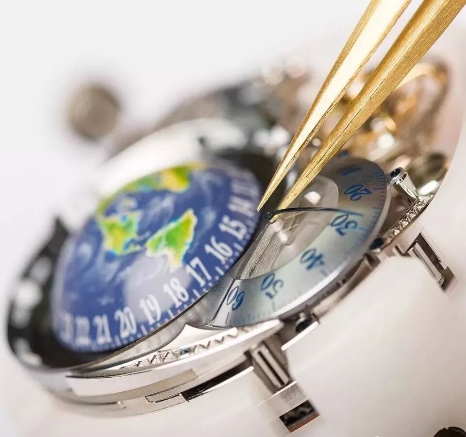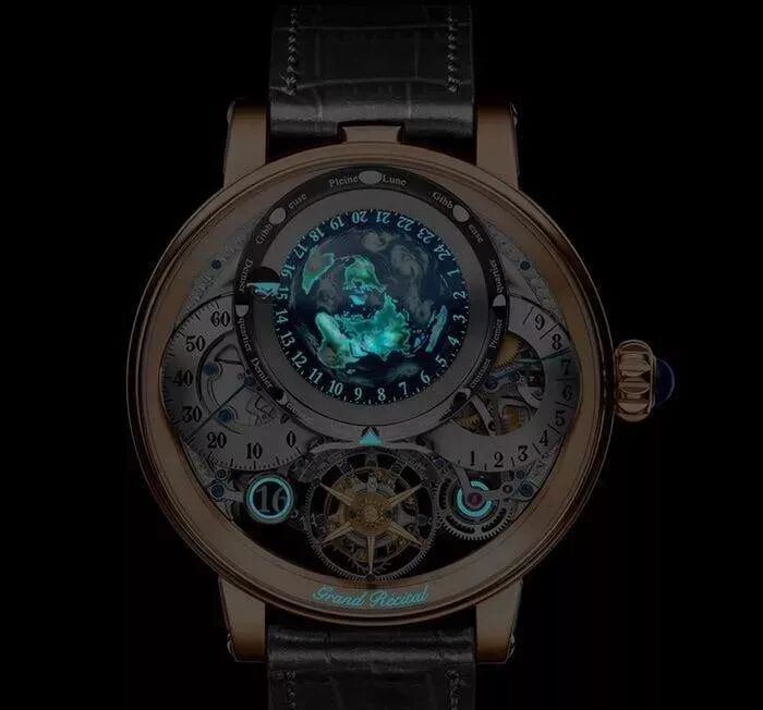 在腕表上方正中央的,是每24小時(shí)逆時(shí)針?lè)较蜃赞D(zhuǎn)一圈的3D地球儀。地球儀上以多層亮漆繪畫(huà)了北極角度觀看的陸地和海洋,由于亮漆加上了發(fā)光物料,所以在暗黑環(huán)境下觀看特別突出。