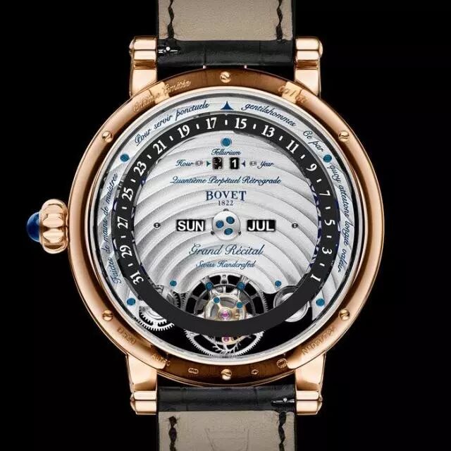 來(lái)自瑞士的頂級(jí)制表品牌Bovet,今年推出了極具復(fù)雜工藝的Récital22 GrandRécital腕表,是今年迄今為止我們見(jiàn)過(guò)的最復(fù)雜的手表之一。該腕表是復(fù)雜性和藝術(shù)性結(jié)合了——陀飛輪、萬(wàn)年歷和鏤空的組合。價(jià)格忒嚇人:紅或白金,469800美元;白金502200美元。