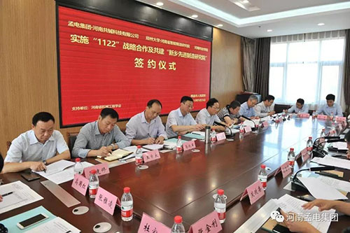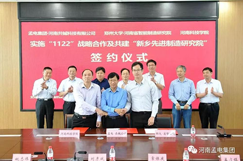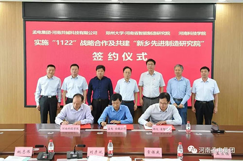2019年9月25日上午,孟電集團·河南共鋮科技有限公司、鄭州大學河南省智能制造研究院與河南科技學院實施“1122”戰略合作、共建“新鄉先進制造研究院”簽約儀式,在輝縣市委市政府會議室成功舉行。