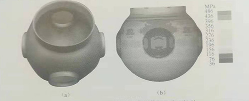 圖1-16哈工大研制的復(fù)雜形狀深腔曲面構(gòu)件(a)實(shí)物照片;(b)等效應(yīng)力。