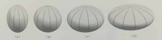 前期的理論分析和大量實驗研究表明:采用無模液壓成形只能成形出軸長比(長軸直徑與短軸直徑之比)1≤λ≤√2的橢球殼體,可獲得合格產品。對于軸長比λ>√2的橢球殼體,在液壓成形過程中,因赤道帶存在緯向壓應力導致起皺,而無法成形出合格產品;對于軸長比λ<1的長橢球殼體,因極板剛度大難于發生變形,導致無法成形出合格產品,如圖1-17所示。