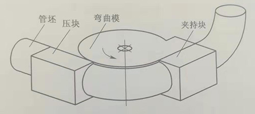 彎曲模通過連接機構和彎曲機的機床主軸連接在起,管材彎曲時,管材的一端由夾持模夾緊在彎曲模上,在管材與彎曲模的相切點外側裝有支撐模,內側裝有防皺模,管材內塞有芯棒,彎曲模繞機床主軸旋轉,管材即繞彎曲模逐漸彎曲成形。通過彎曲機的夾持裝置夾持管材的后端將管材的軸向前進或周向旋轉,達到軸向加力或空間角度的變化目的,以此實現三維空間彎曲。