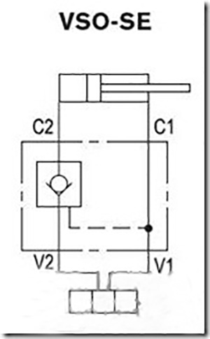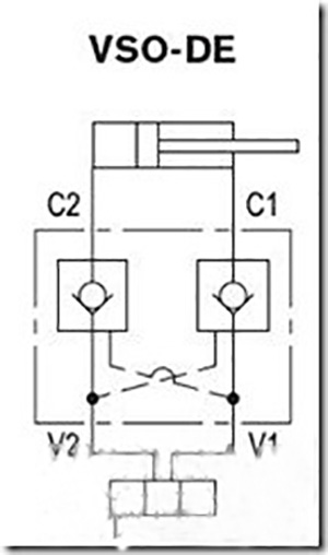 液控單向閥:是允許液流向一個(gè)方向(V2到C2)流動(dòng),反向開啟則必須通過(guò)液壓先導(dǎo)控制來(lái)實(shí)現(xiàn)的單向閥。本類型以無(wú)泄漏的方式工作,十分適合于很多夾緊功能的運(yùn)用,也能在軟管失效(破裂)的情況下,防止逆向負(fù)載的失速掉落。這些閥的安裝應(yīng)當(dāng)盡可能靠近執(zhí)行器,既能采用法蘭連接,也可以通過(guò)管道的方式安裝。