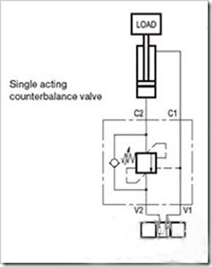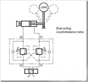 對(duì)于成對(duì)的液壓缸而言,絕對(duì)不能使用液控單向閥:因?yàn)橄葘?dǎo)壓力首先開啟輕負(fù)載的閥而將所有負(fù)載加載在另一個(gè)閥,造成壓力偏高和油缸故障。