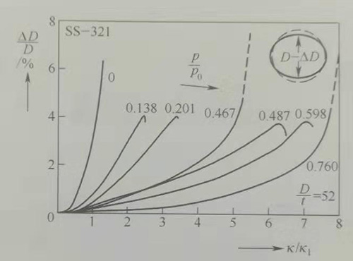 圖3-9~圖3-11所示為德國斯圖加特大學研究結果。其中:△D為截面直徑變化量,△D/D為管材截面直徑變化率;k為彎管的曲率,k/k1為歸一化的曲率,k1=t/d2;P為管材內壓,Po/P為歸一化的內壓,Po/P=2σot/Do。
