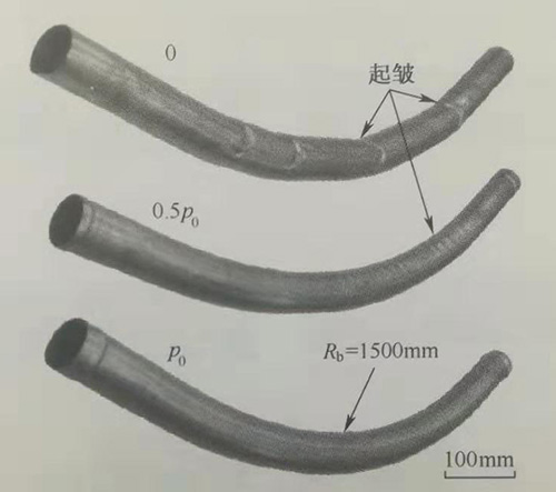 同時,支撐內壓對管材臨界起皺曲率具有重要影響,隨內壓的升高,管材臨界起皺曲率大幅增加,當內壓為0.76ps,極限相對彎曲半徑達到7,為無內壓時的1/6。