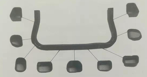 利用內凹預成形截面降低整形壓力的原理,針對該副車架主管件的截面形狀特點,設計了具有不同內凹截面的預成形坯,不但保證了內高壓成形過程的順利進行,還有效地控制了截面沿周向變形的均勻性和壁厚的分布,獲得了合格的零件,如圖3-49所示。