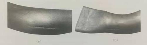 a)彎曲外側(cè)開裂;(b)過渡區(qū)域開裂。