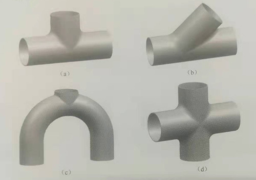 多通管件的種類較多,按照多通數(shù)量分為直三通管(T形管)、斜三通管(Y形管)、U形三通管、X形四通管和五通以上的多通管,如圖4-1所示。按主管、支管直徑大小分為等徑和異徑多通管;按軸線形狀,分為直線和曲線多通管;按對稱性,分為對稱和非對稱多通管。