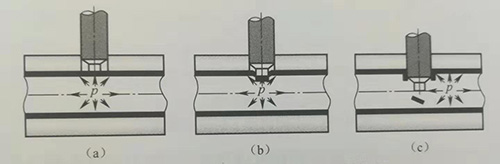 (a)管壁貼膜初始狀態;(b)液壓沖孔;(c)翻邊。