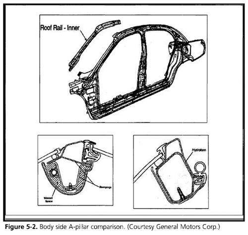 在圖5-2中所示的車身結(jié)構(gòu)的A柱部分,比較沖壓車頂軌內(nèi)截面設(shè)計與液壓成形設(shè)計(Bruggemann?1997)。