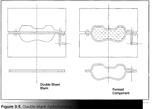 雙毛坯液壓成形方法也稱為枕形成形或平行板液壓成形,如圖3-5所示。在上下模之間放置兩個圍繞外圍焊接的已開發(fā)的鈑金坯料。