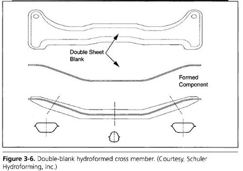 然后將流體壓力引入坯料中間,將材料拉伸成形到模具型面。該方法可用于生產(chǎn)不同長度線的組裝和全封閉截面,如圖3-6所示,每個毛坯的厚度可以不同,以滿足質(zhì)量和結(jié)構(gòu)性能要求。