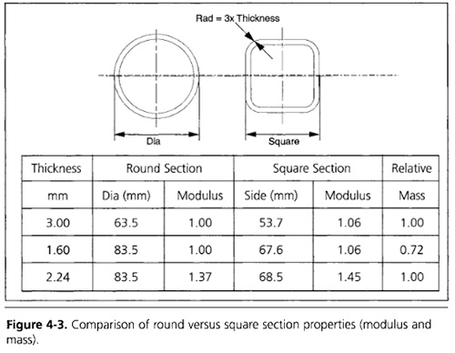 圖4-3中的表格顯示了基于2.5英寸(64 mm)的方形截面,直徑圓形截面對于相同質(zhì)量具有6%的較高強度。