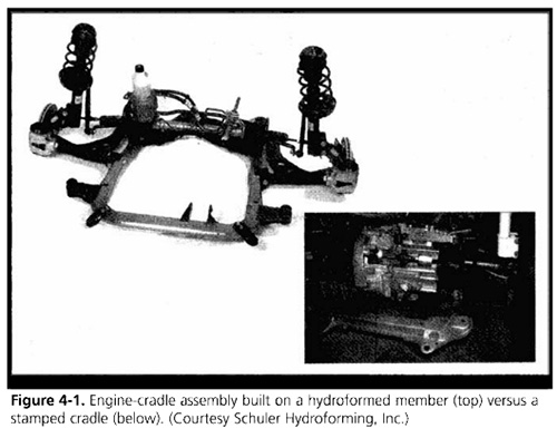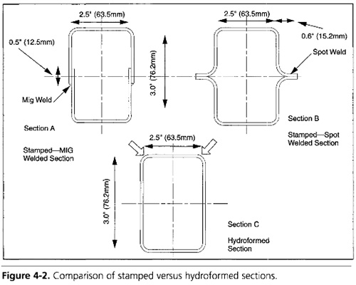 圖4-2比較了兩個沖壓組件與相同的內(nèi)高壓成形組件。