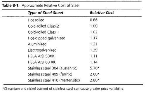 各種等級(jí)的銅管用于管道工業(yè),不同等級(jí)鋼的相對(duì)成本比較如下,見表8-1(1996年汽車用鋼設(shè)計(jì)手冊(cè))。