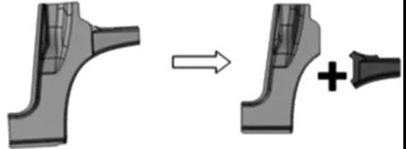 (3) 一些形狀極不規(guī)則的件也盡量考慮拆分成較規(guī)則件后再 焊接的方式生產(chǎn),如圖 2 側(cè)圍 A 柱內(nèi)板拆分前材料利用率只有 30% ,拆分成兩個制件后整體材料利用率可以達到 58% 。反之, 有時也可以把不規(guī)則的相連接件合并成一個較規(guī)則的件生產(chǎn)。
