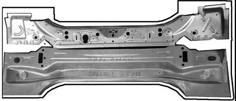 (8) 模具設(shè)計時盡量考慮一模雙件,也可以考慮不同零件合 用一套模具生產(chǎn): 如國外某款車型后圍板和后鎖板( 圖 3) ,可以節(jié) 省兩件連接部分的拉延邊,提高材料利用率。