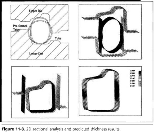通過改變管與刀具表面的摩擦系數(shù),可以進行參數(shù)化研究,以確定不同潤滑方式的效果;在模具關(guān)閉和最終校準過程中,還可以評估管內(nèi)流體壓力變化的有效性。二維模擬的預(yù)測厚度結(jié)果如圖11-8所示。
