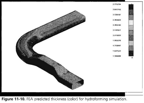管內(nèi)壓力可以用體積流量或直接指定壓力作為時間的函數(shù)來模擬,表示內(nèi)高壓成形工具設(shè)置的有限元模型如圖11-9所示,預(yù)測的厚度變化如圖11-10所示。