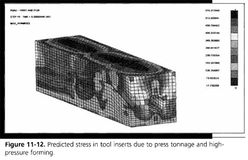 預(yù)測的應(yīng)力和變形形狀顯示了壓力和工具“呼吸”的程度以及容易發(fā)生過早失效的區(qū)域;圖11-11顯示了一組內(nèi)高壓成形刀具刀片的有限元模型,預(yù)測結(jié)果如圖11-12所示。